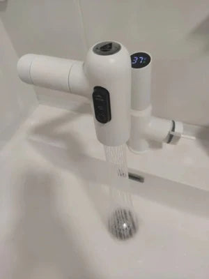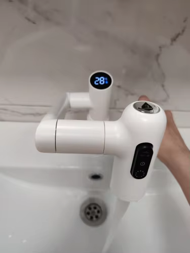 Kyllä, LED-näyttö näyttää veden lämpötilan reaaliajassa.