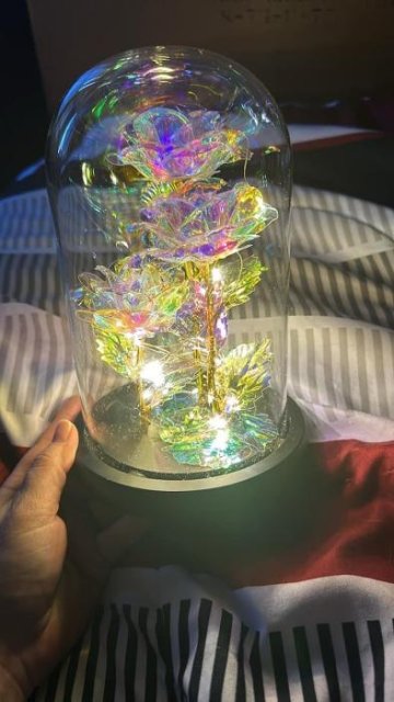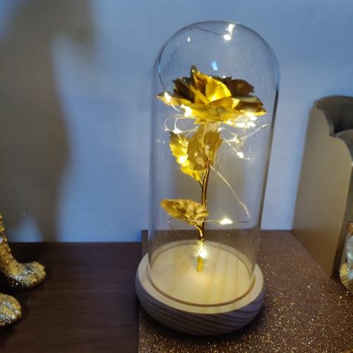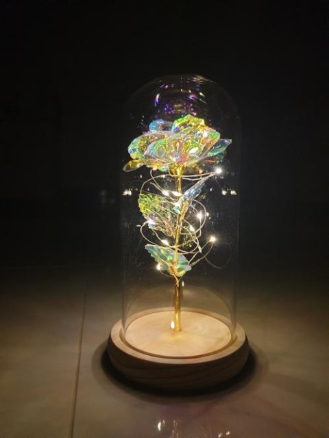 הגבעול המוזהב תומך בורוד איריס מוקף ב שרשראות אור LED שיוצרות אווירה חמימה ורומנטית.